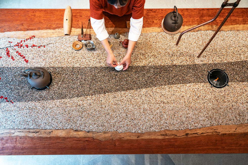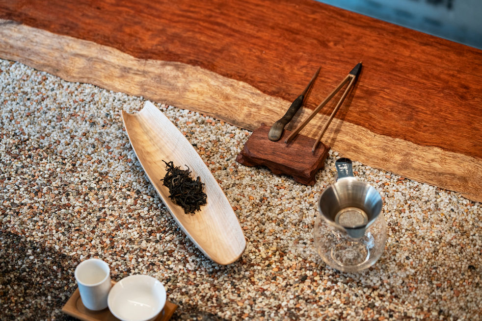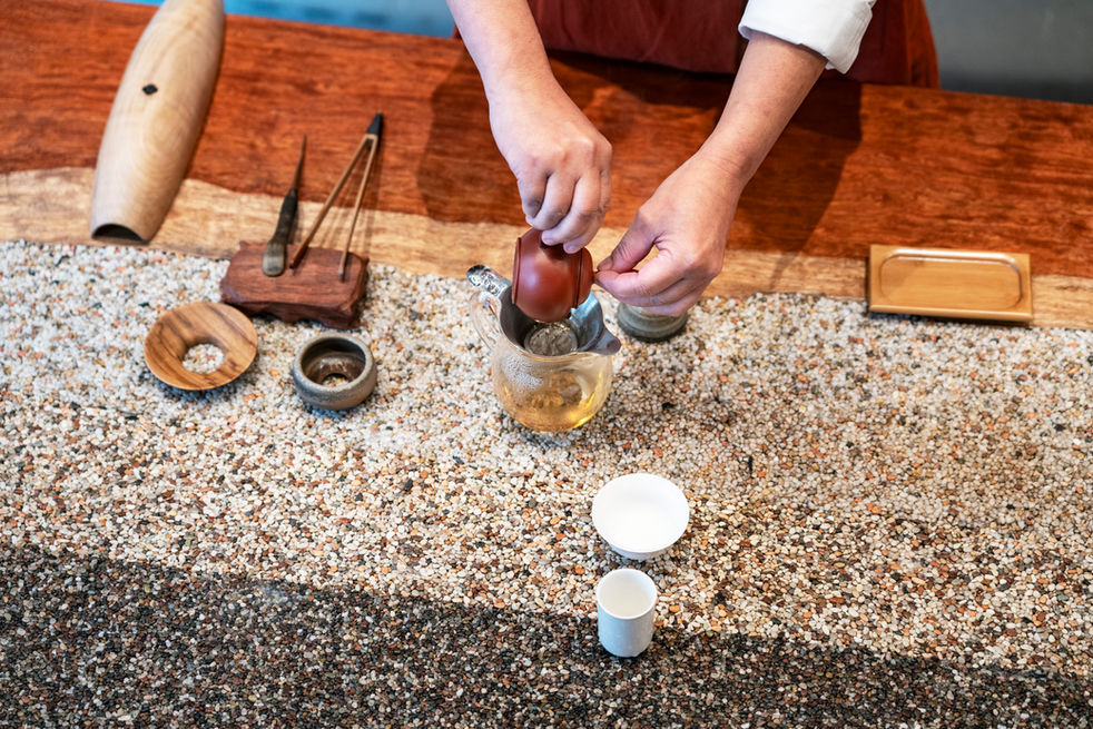 まずカウンターは、対面でリラックスして接客できるように一般的なテーブルの高さに設定し、客と店主が座る長手端部には品質は良いが安価に手に入る銘木の耳の部分を使用した。そしてその銘木と銘木の間を浸透性の左官材で埋め、注いだお湯がテーブル染み込み排水される仕組みとし、お湯を沸かすための火鉢を埋め込み、さらに給水栓も配管することで、茶器を広げ、水を入れ、お湯を沸かし、お湯を注ぎ、お茶を蒸らすという一連の動作をカウンターの上で直接楽しめるようにした。
